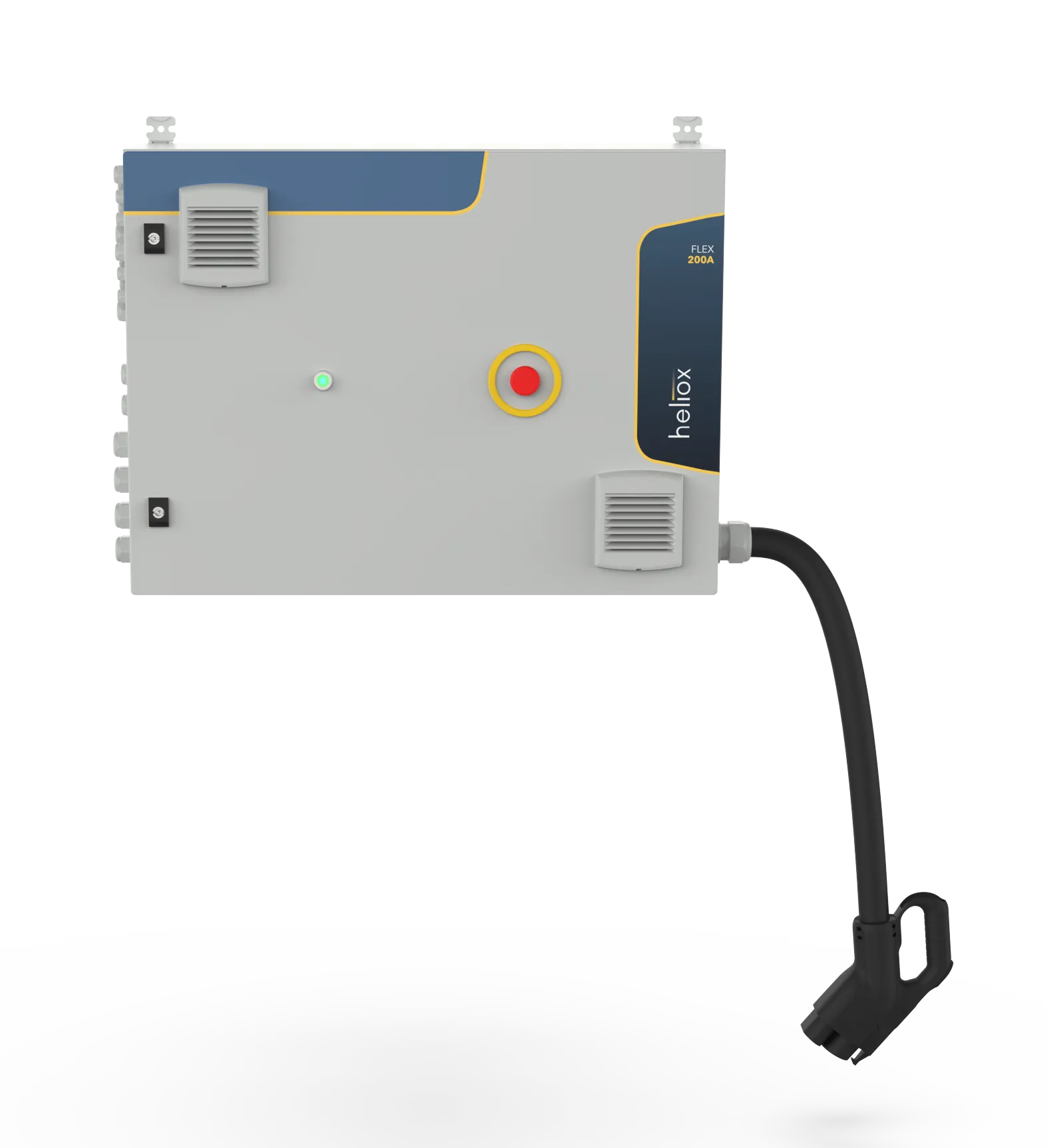 The Heliox Flex 200 A CCS2 dispenser cabinet supports an overhead construction with a CCS2 cable hanging down from a ceiling or gantry structure.