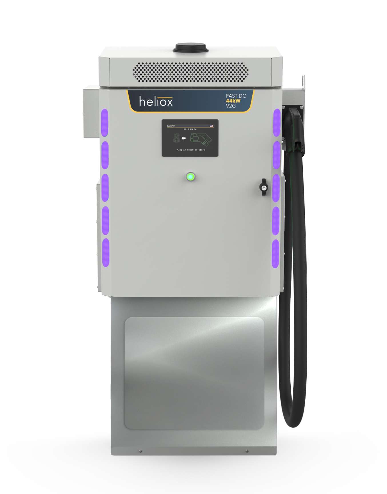 Charging starts automatically after plug in. With 30 A (25 kW), 60 A (50 kW), and Max (60 kW) power options, the Heliox 60 kW charger offers flexibility to match your charging needs and on-site available AC power.